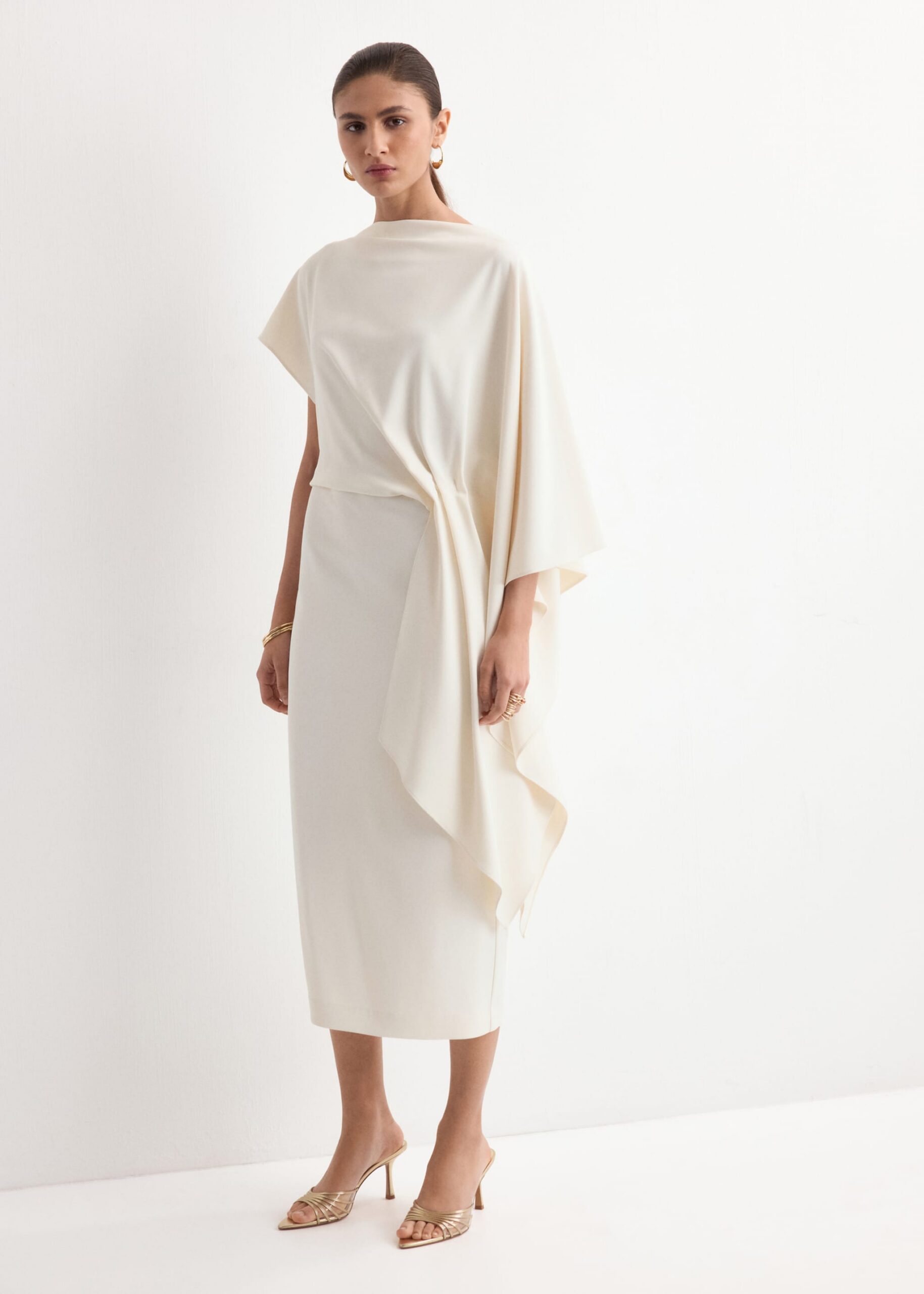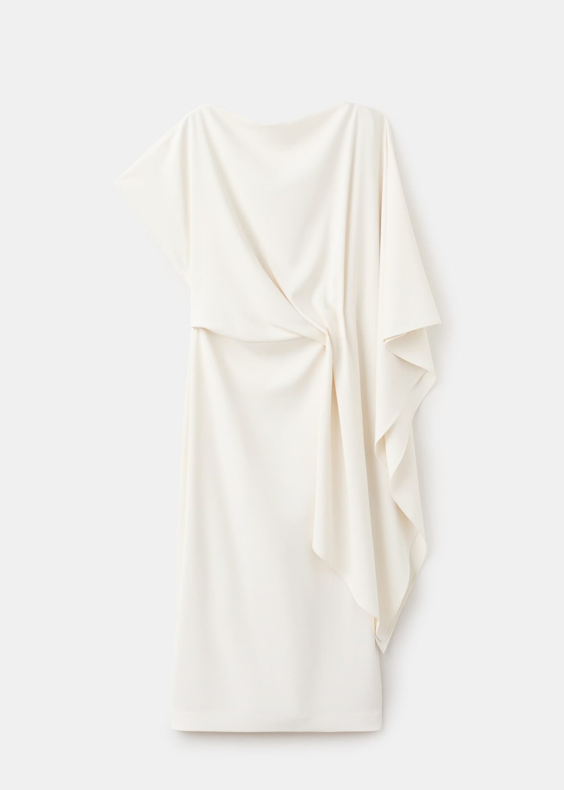 Krój midi. Dekolt typu łódka. Asymetryczne rękawy.